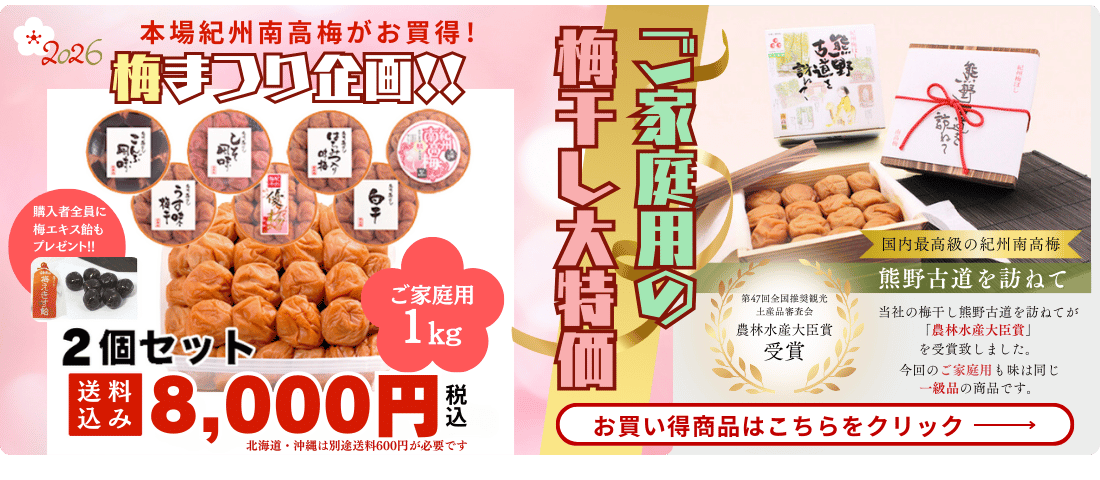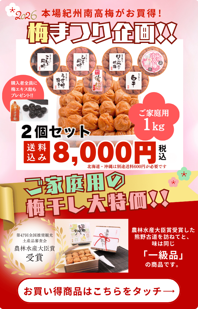 【税・送料込み(北海道・沖縄を除く)】紀州南高梅がお買い得 ご家庭用1kg×2個セット8,000円|2026年梅まつり企画|今なら購入者全員に梅エキス飴をプレゼント ¥8,000