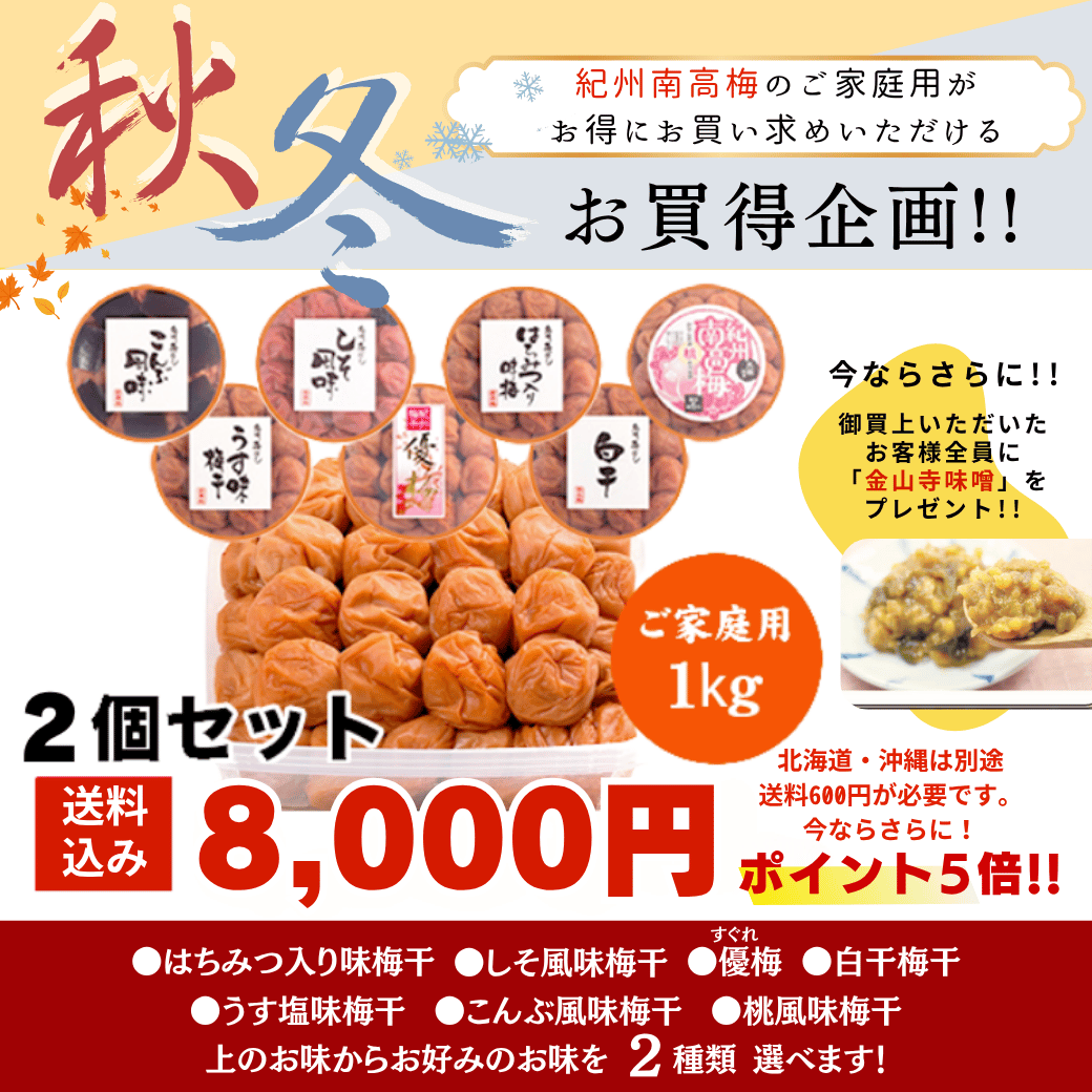 【送料込み(北海道・沖縄を除く)】紀州南高梅がお買い得 ご家庭用1kg×2個セット|2025年秋冬のお買い得企画|購入者全員に「金山寺味噌」をプレゼント&今ならポイント5倍! ¥8,000