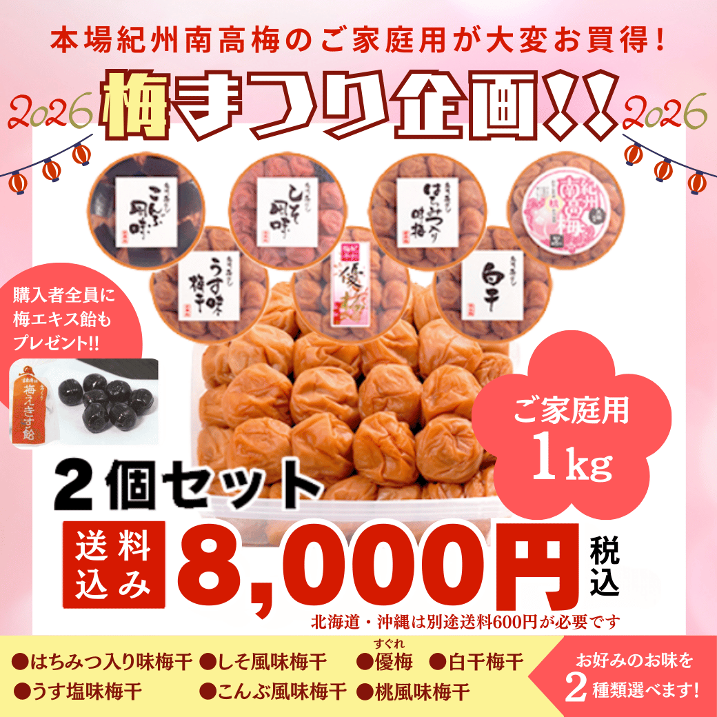 【税・送料込み(北海道・沖縄を除く)】紀州南高梅がお買い得 ご家庭用1kg×2個セット8,000円|2026年梅まつり企画|今なら購入者全員に梅エキス飴をプレゼント ¥8,000
